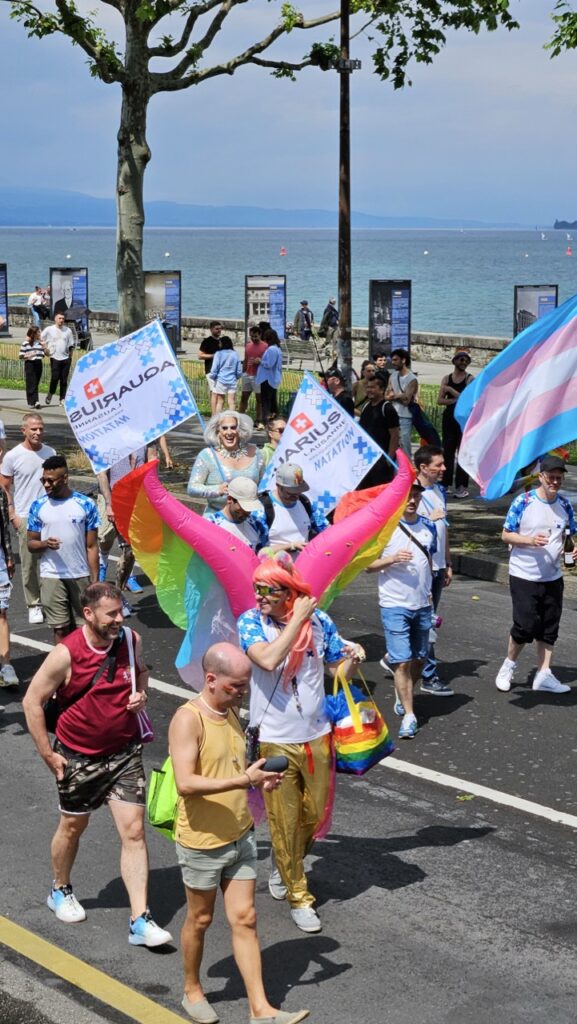 You’d see running clubs, health initiatives, advocacy groups, and, of course and drag performers at the march. At the front, there was already promotion for the next Pride in Lausanne in 2026.